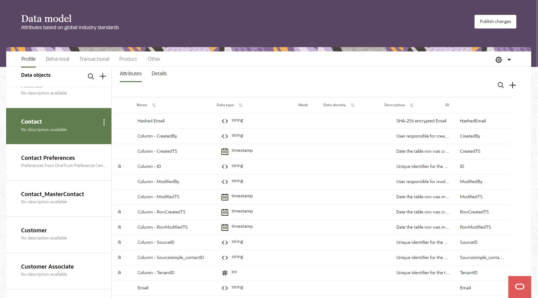 Dans le langage d’Oracle, un “attribut” est un champ d’un “data object”. Par exemple, le data object “Address” inclut les attributs : Ville, Pays, Code postale… Dans le modèle de données par défaut, les data objects – qui sont en fait des tables – sont regroupés dans des groupes d’objets pour faciliter la lecture du modèle : Profile, Behavioral, Transactionnal, Product, Other.