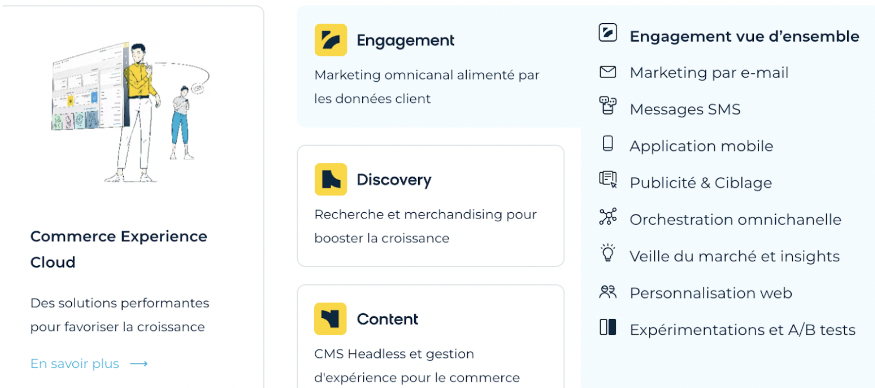 Bloomreach a constitué son offre par des rachats successifs. L’éditeur propose aujourd’hui 3 principaux produits :
