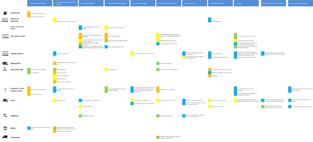 Nous ne détaillerons pas ici la méthodologie des parcours clients. C’est un sujet que nous avons traité dans un article du blog et que nous abordons souvent par ailleurs sur CustUp. Contentons-nous de rappeler que cartographier les parcours clients consiste, schématiquement, à mapper tous les points de contact dans une matrice à deux variables : canaux & étapes. Les points de contact sont la réunion d’une étape et d’un canal. Par exemple : « Je me connecte au site pour m’inscrire au programme de fidélité » est le point de contact. Le canal est « site web » et l’étape « Souscrire au programme de fidélité ». Un parcours client met en jeu des points de contact, des étapes et des canaux.