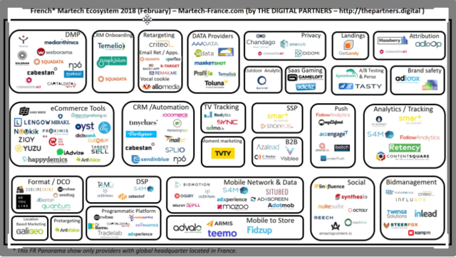 Si le marché du CRM reste dominé par des éditeurs anglo-saxons, beaucoup d’acteurs français sont apparus ces dernières années sur le marché des technologies marketing. A ce sujet, le site Martech-France a publié un tableau très intéressant. Il s’agit essentiellement de solutions Best of Breed, positionnées sur un segment spécifique.
