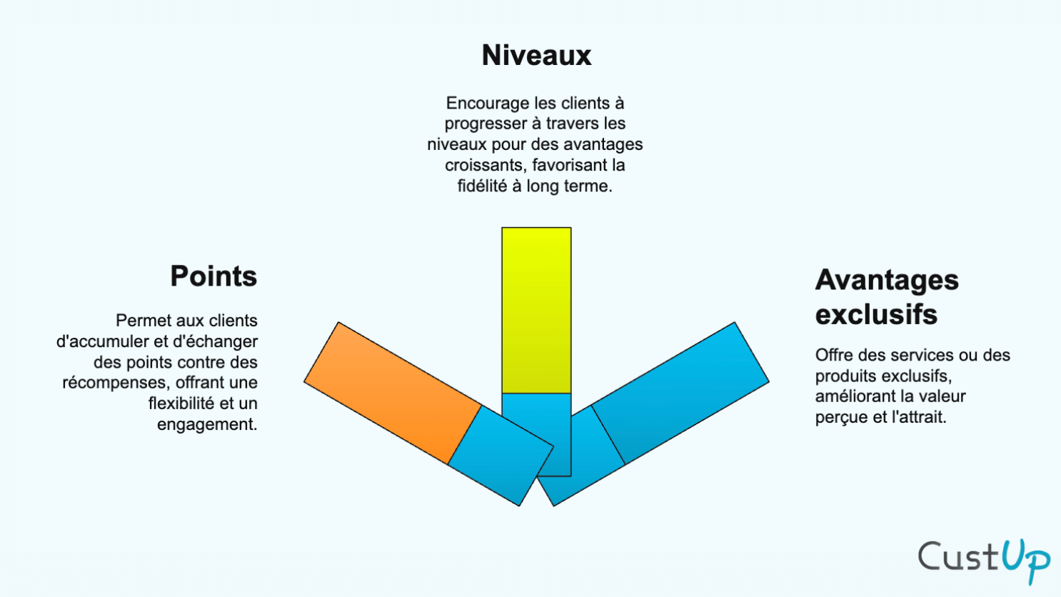 - Niveaux : les clients progressent à travers différents niveaux de fidélité, chacun offrant des avantages progressifs.