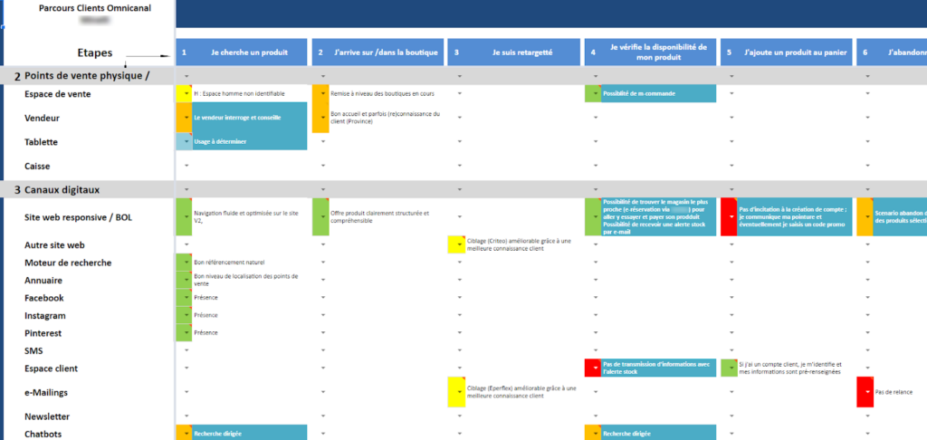 - Nous commençons par qualifier l’ensemble des points de contact du parcours, en les rattachant à des étapes et sous-étapes, des canaux et sous-canaux. L’enjeu est d’avoir une vue exhaustive des interactions possibles entre le client et la marque.